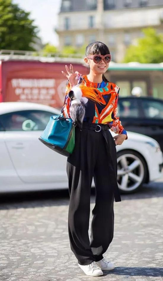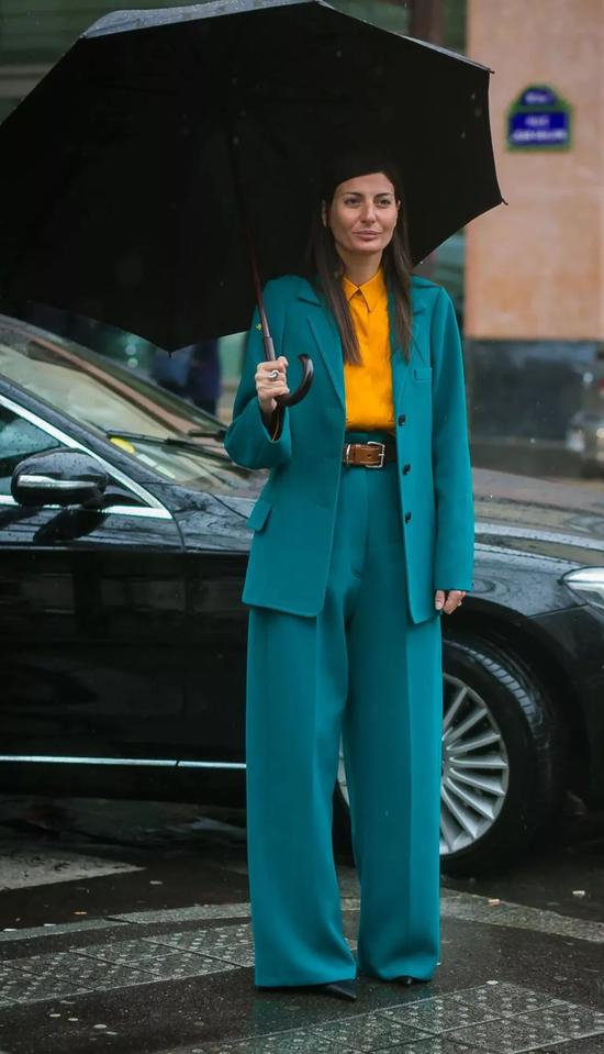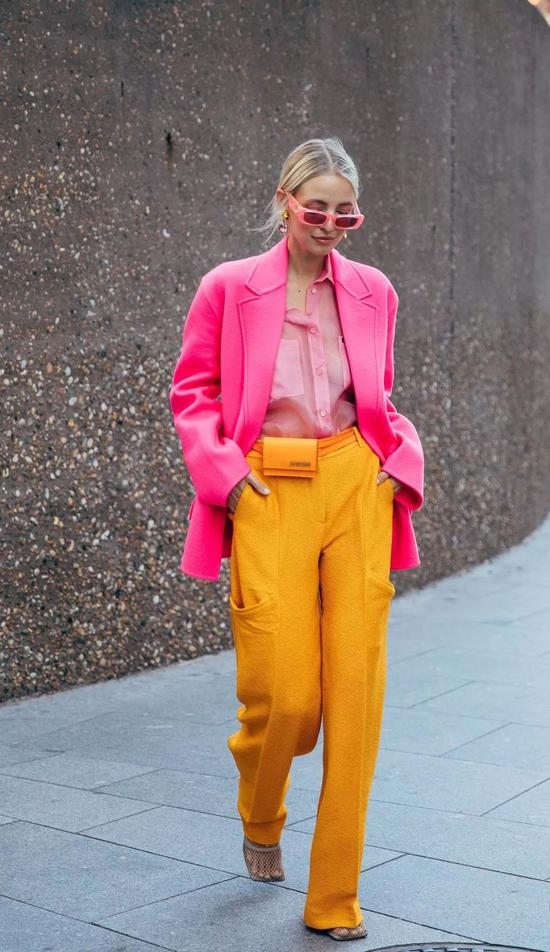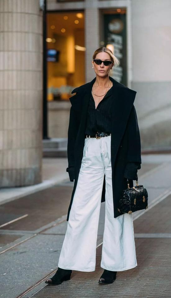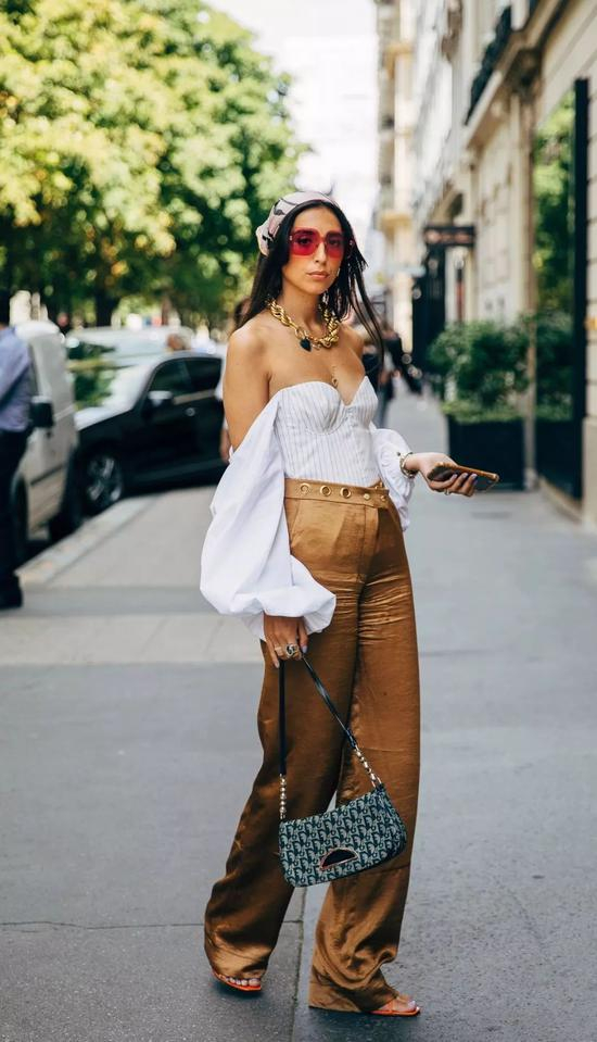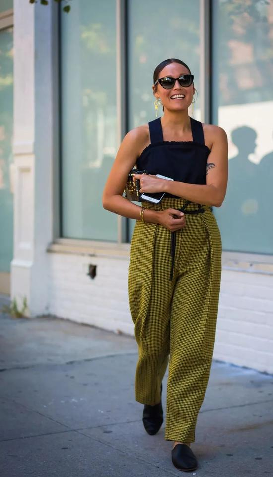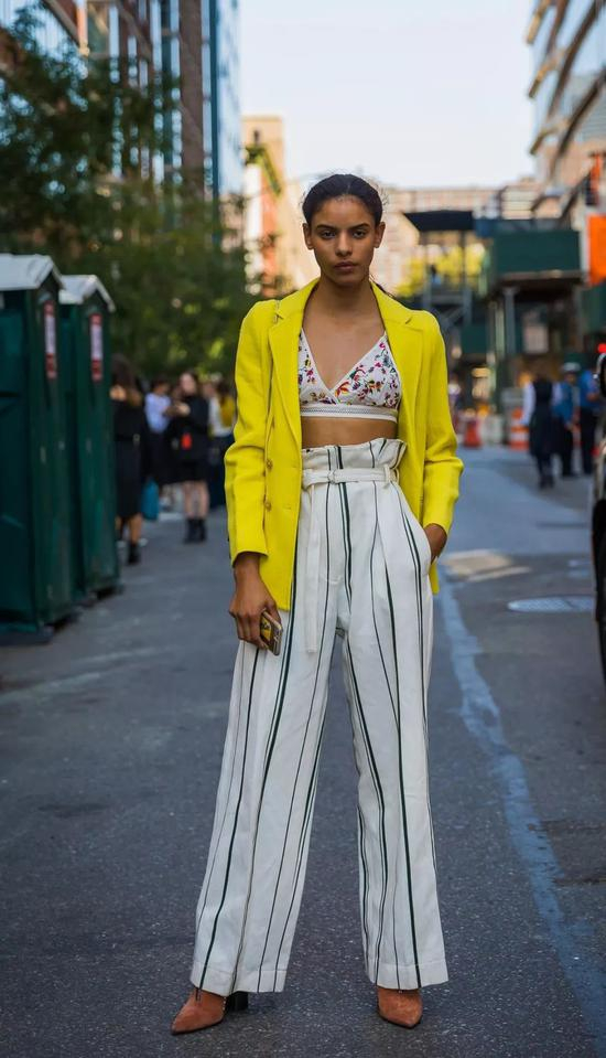 配色上依旧遵循黑白灰原则不会错,除此之外,撞色搭配也是高腰阔腿的秘诀之一,不仅能拉长下半身比例,更能让全身造型看起来超SLAY~