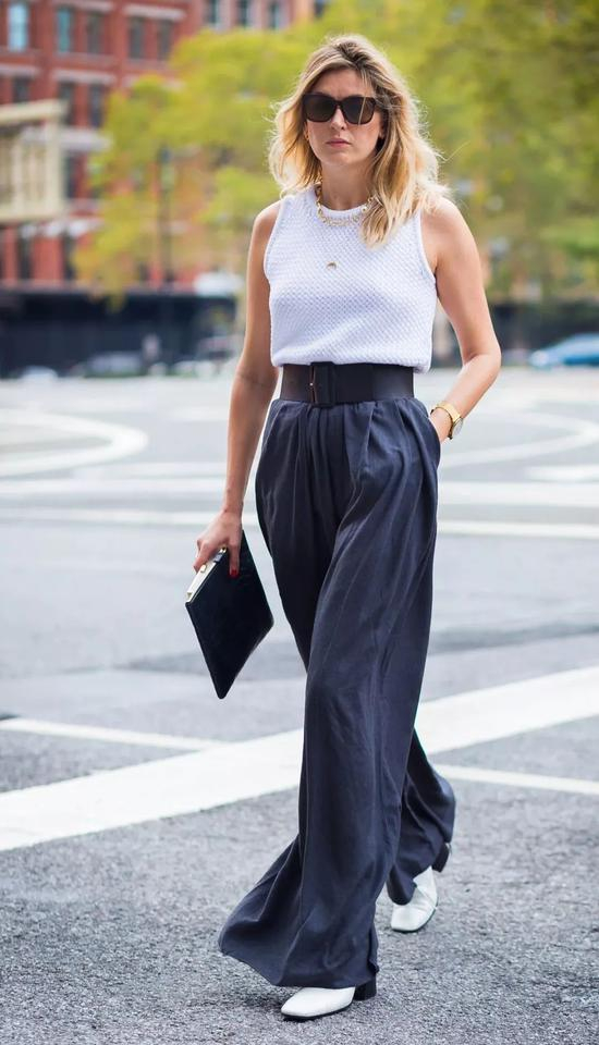 而白色/蓝色等浅色系的高腰阔腿裤,非常适合爱穿职业装的女生。上身搭配蕾丝性感十足,搭配衬衫OL风满分,搭配T恤休闲气质超酷的!