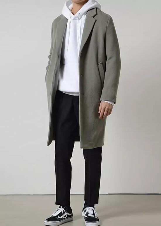 穿大衣除了打造优雅的绅士风,在当下和潮流的运动单品混搭时造型也很抢眼。运用连帽卫衣做内搭造型层次感就很丰富,这样也使大衣搭配的造型变得更加年轻活力化。