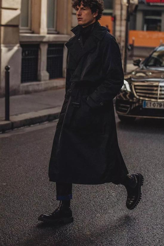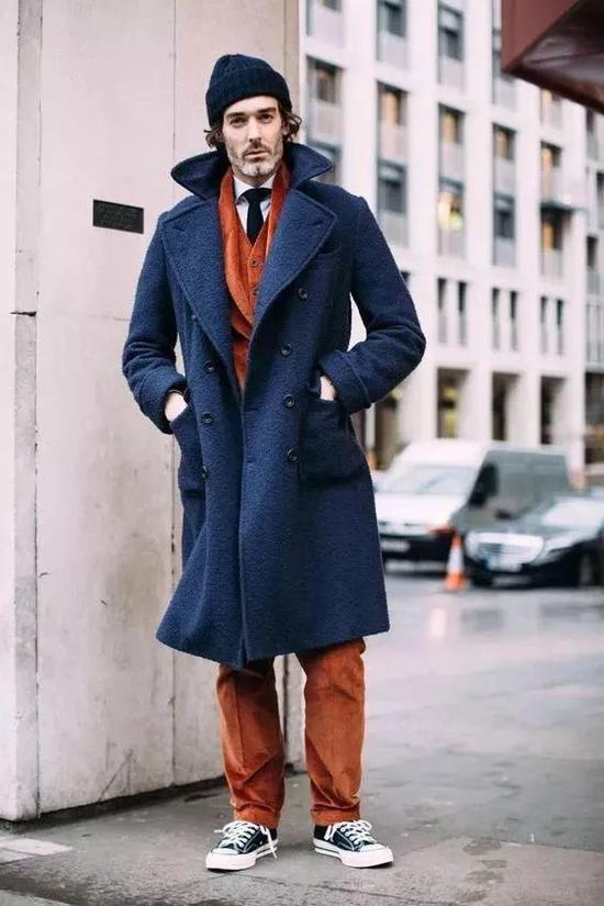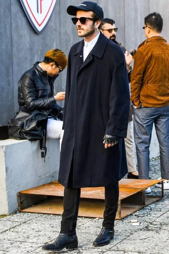 上下身同色在视觉上具有拉伸效果,如果觉得单一色系乏味,可以尝试搭配一款浅色内搭,内浅外深的穿搭法则不仅使整体造型层次分明还降低了驾驭难度。