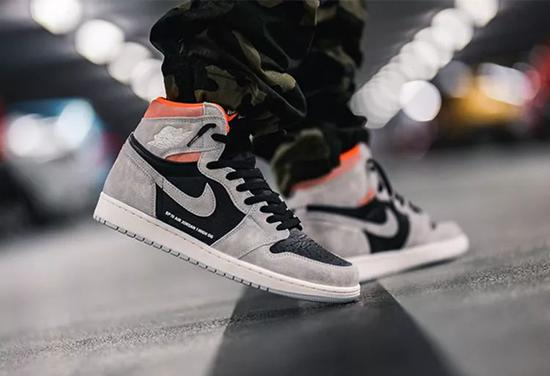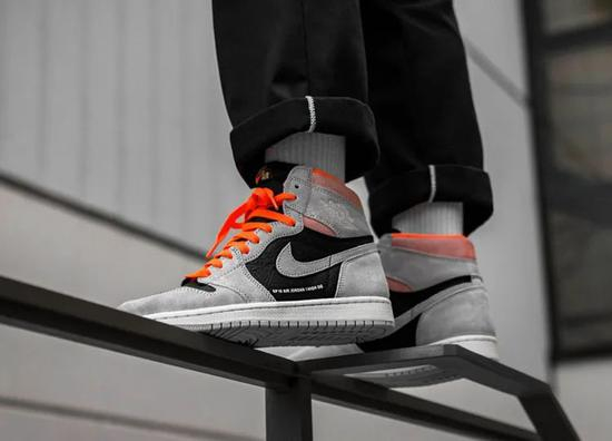 眼前这双‘灰麂皮’Air Jordan 1 有着如同三文鱼配色般的视觉效果,发售前夕的预售价格曾飙至¥3000 元以上,高级的麂皮鞋面搭配黑色鞋身与橙色鞋帮点缀,构成了独具一格新式 Air Jordan 1 风格。