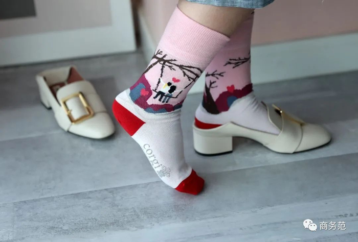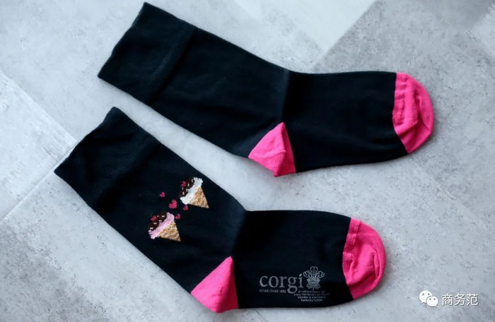 此外,CORGI家的袜子,印花和图案还是一大特色,这些彩色区域不易掉色,因为每一双袜子上的色料都是只染纱线不染布,这样可以保证袜子的色牢度更高,而且不易变形。