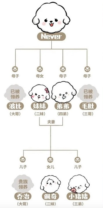 Never家族其实有好几只狗狗,为了方便大家了解这几位,家族图谱奉上: