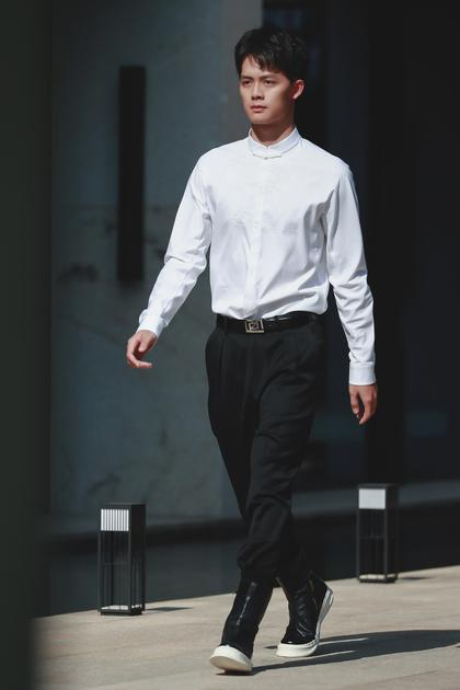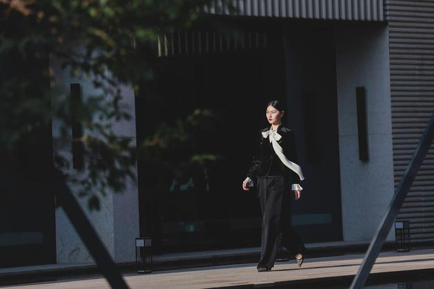 移步翠竹别院,模特伴着潺潺水流声走动若隐若现,不甚惬意。曾凤飞品牌本季发布会的场址选择隐遁于厦门私人海岸线的Lohkah Hotel & Spa 七尚酒店,就是希望能借七尚酒店建筑私密而有序、简约而优雅,刚柔并济的律动感与新一季服装系列在空间上的跨度反差带给人们不一样的思考和视觉碰撞。