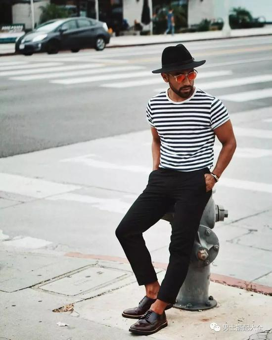 不要觉得自己黑,就穿不出绅士风,西装裤淡蓝色衬衫与小皮鞋轻松打造绅士风,整体感觉也不会很突兀。黑白条纹与黑色裤子的跳跃搭配,简简单单,非常值得大家去借鉴。
