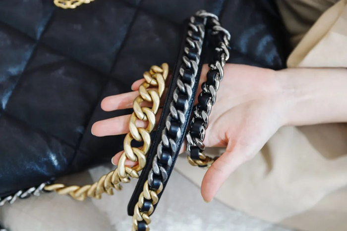 一共配了两根链条,长的可以斜挎,短粗链则可以手拎。整个包因为粗细链条的搭配而很有分量,摸上去凉凉的,夏天感觉可以瞬间降温。穿休闲装背上它很酷炫,几乎很难撞款,完全是我的style惹。(崔斯坦:这一看就是我的包
