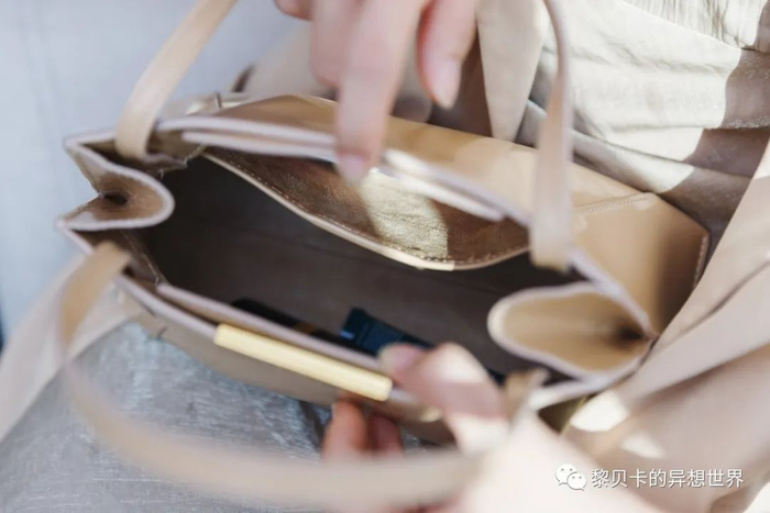 它的皮质偏硬,再加上手柄偏细,拎起来有点割肉,哪怕只挽着几分钟手臂上就会留下红印子。而且走线不够精致,细节处的皮革还有小裂缝。
