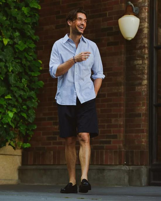 像这种间隔大的 细疏条纹短衬衫,它没有明显的突变感觉,仅仅是比纯色短衬衫多了几道条纹而已,但也正是如此,在夏日的风格之中,它看起来要相当清爽自在,又无死板老套的危险存在。