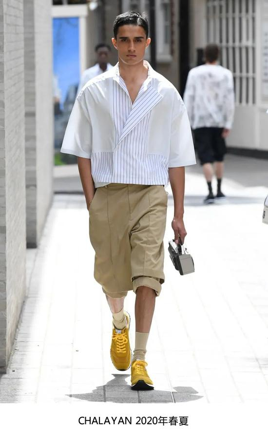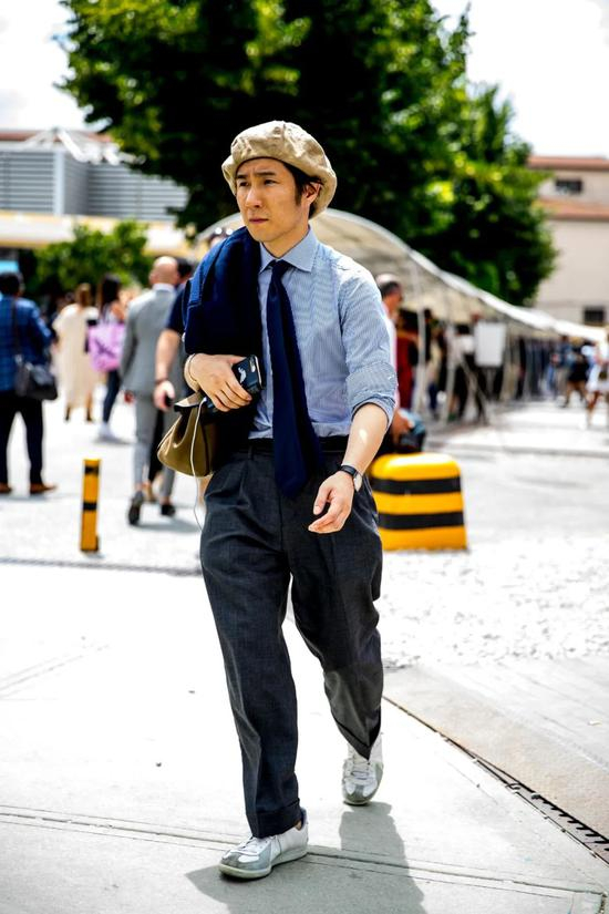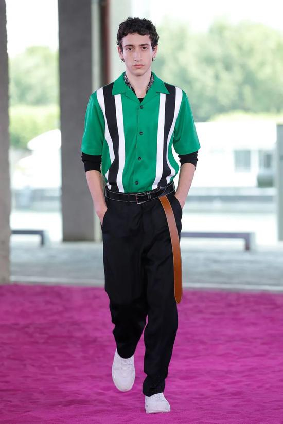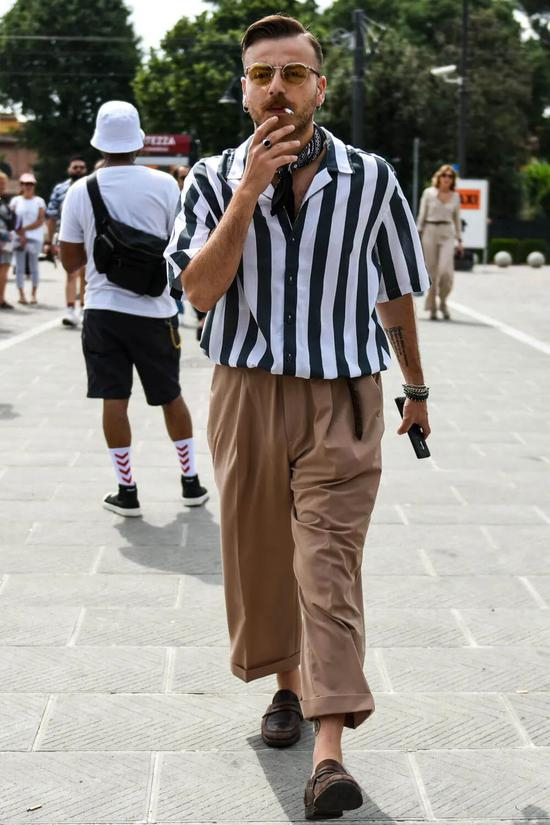 但作为男性夏日的通勤装,因为有了撞色条纹的修饰存在,也能让你摆脱普通短袖衬衫加西裤时的无聊成分,稳中带“骚”。