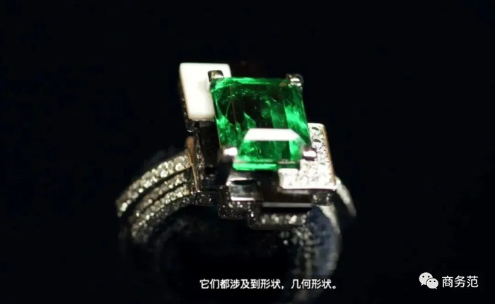“建构几何”系列作品造型也非常独树一帜,层叠的几何形状,烘托出天鹅绒般的赞比亚祖母绿,无比夺目耀眼。