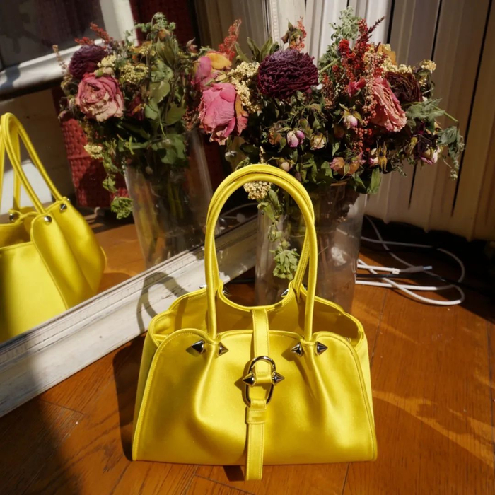 芒果黄的配色很时髦,背的人也比较少,但其实也不难驾驭,和一些深色调的衣服能很容易地搭配在一起,让整个Look一下子就有了亮点,上身立马成为这条街最亮眼的崽~