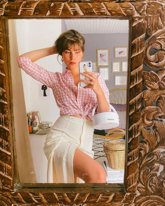 法国女孩们还很喜欢用浅色的维希格纹衬衫来打结,再加个草编包就是清新的田园女孩了。▼