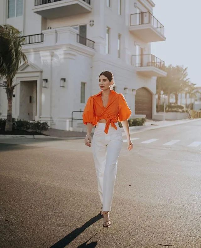 这种短上衣一般都有配套的下装,穿一套出门很度假,尤其是配材质飘逸的半裙或者阔腿裤。▼