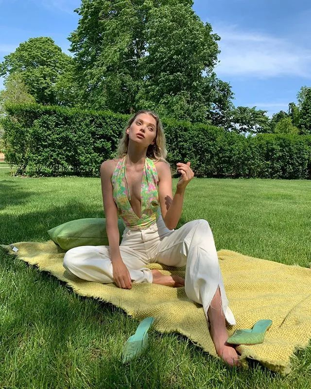Elsa Hosk穿的这件跟很多人撞衫了。深V的挂脖上衣性感又复古,让人想起梦露的年代。从某种角度来说它也能优化肩颈线条,因为可以遮住斜方肌,同时还有无敌深V拉长脖子,难怪以前很多性感女神都爱穿。▼