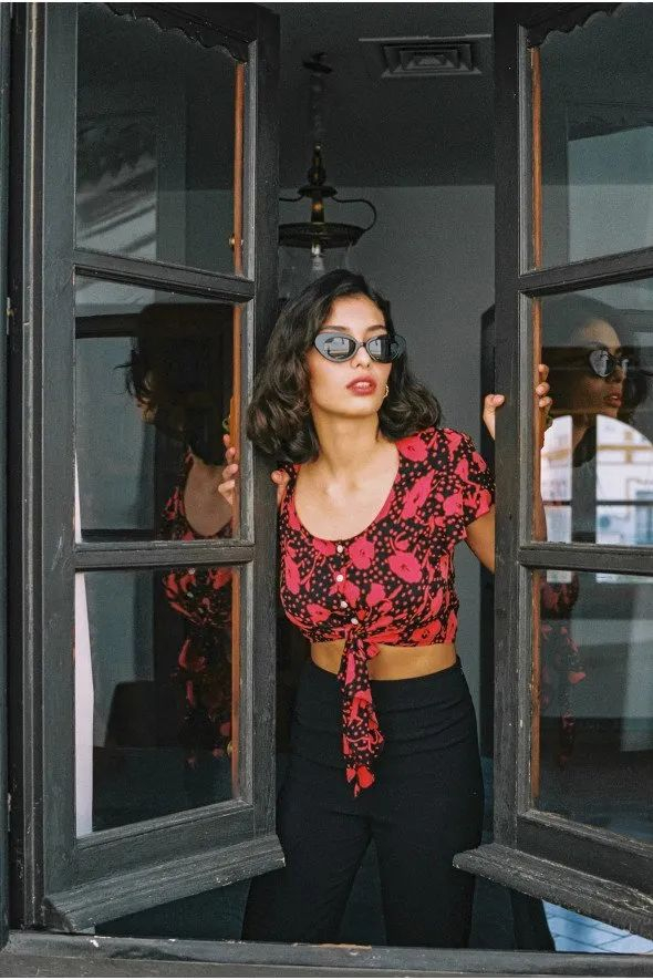 不过更多的款式还是我前段时间写过的打结衬衫,特点是深V领口,在上半身形成一个X型。用于打结的带子也都比较长,扎起来很飘逸。▼