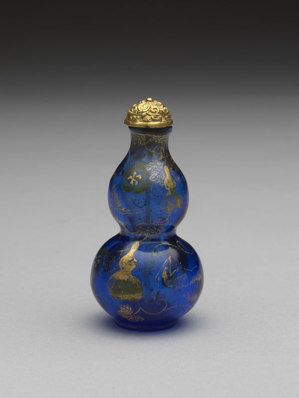 不同于西洋用盒盛装这种轻细的粉末,清代宫廷将其改成小口、广腹带匙盖的鼻烟壶,成为当时的时尚风潮。从早期的各色玻璃到套玻璃、不同矿石牙角的雕刻,再到金属胎画珐琅以及极难烧制的玻璃胎画珐琅,或是瓷胎,甚至模制葫芦工艺,后来鼻烟壶发展出专属的内绘技法,几乎囊括当时各种制作工艺于方寸间的小瓶。