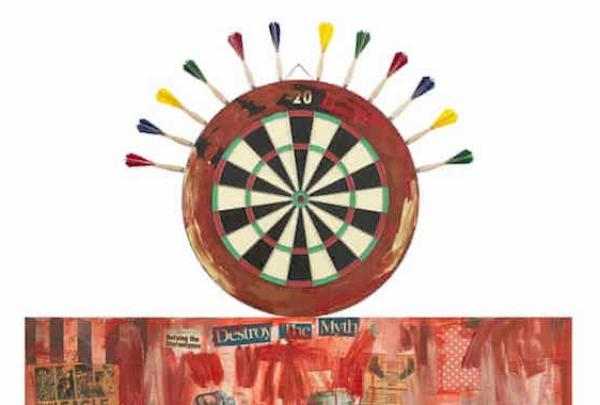 史密斯(Smith)引用了约翰斯(Johns)创作于1958年的著名绘画《靶子 (Target)》,该作品描绘的是一个涂色的靶心。在这里,她将飞镖游戏的靶子放置在艺术品的顶部,并以羽毛状的飞镖来装饰,以此代表美国原住民的视角。在下方的画布上,她用来自 Char-Koosta News(她生长的弗拉特黑德(Flathead)保留地的官方出版物)的报刊图片进行了拼贴。“我将照片按直线排列,以模仿安迪·沃霍尔的《橙色车祸(Orange Car Crash)》,因为我当时正处在悲剧之中。”图案贯穿着整个画布表面,上面有文字:“毁灭神话”,边上是史密斯所在部落的原住民照片。她说:“神话是原住民战士一直像欧洲人一样处于战争状态。只有我们没有马、剑或枪。”