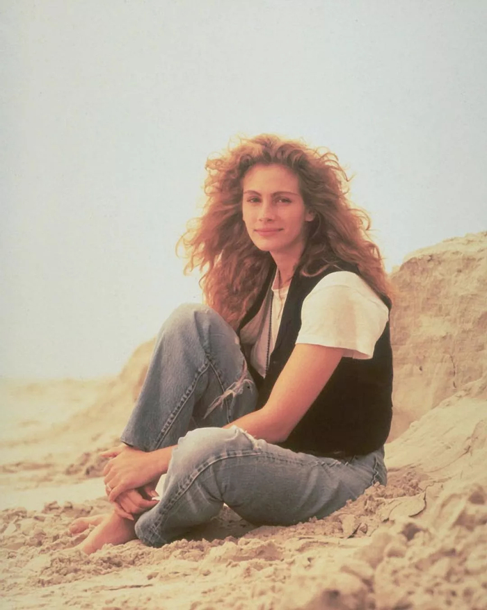 到了八十年代末,很多设计都在参考十八世纪的华丽马甲,丝绸、天鹅绒、刺绣等元素又回来了。1986年和1989年的茱莉亚·罗伯茨。▼