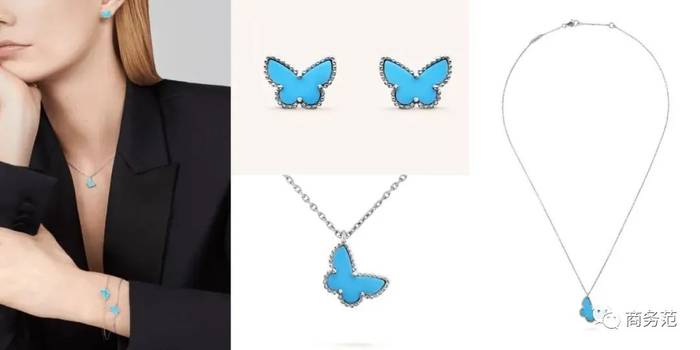 梵克雅宝的绿松石珠宝,除了经典的四叶草系列,还可以入手Sweet Alhambra系列。这个系列从耳钉到项链一应俱全,都以绿松石来搭配白K金,蝴蝶元素轻盈精致,戴起来有种自然灵动的感觉,价格从13900到23500不等~
