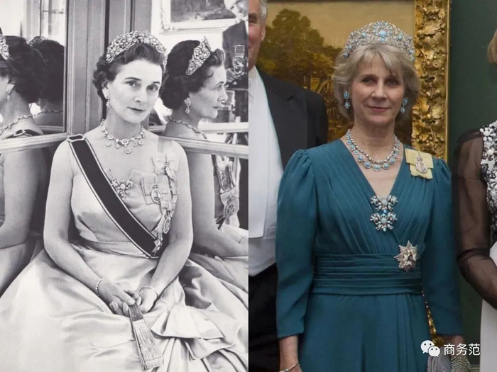 瑞典王室旁系还有一顶绿松石之星,历史更为悠久,最初是瑞典英格伯格公主的结婚礼物。后来她送给了大女儿马格瑞莎公主,公主又传给卢森堡露丝伯爵夫人,现在辗转到了朱塔伯爵夫人手上。而这期间借戴过的贵族,连起来能串成一部欧洲史~