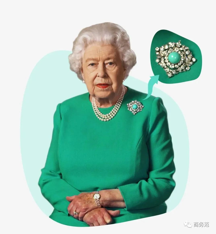 不少王室成员都是绿松石的拥趸。今年上半年女王发表电视讲话时,就佩戴了祖母玛丽王后传给她的绿松石钻石胸针,传达出了无限希望。