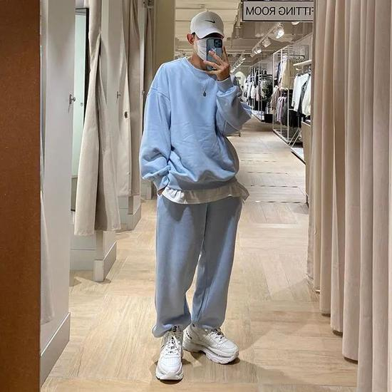 今年看到比较流行的是一套同色运动装里面搭一件白色T恤,虽然搭配很简单,但视觉效果特别好,很适合懒男孩学习。