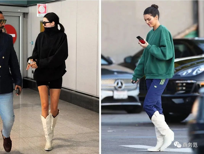 美国品牌R13这双白色西部靴一度成为Kendall最爱,穿运动装的时候混搭它都不违和,这款靴子就是标准的西部靴设计,靴筒口有一个V形剪裁,视觉上会拉长腿部线条。