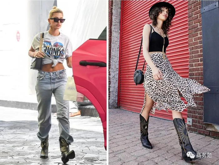 意大利品牌Golden Goose也推出过很多西部靴,Hailey之前有穿过,像她这样搭配牛仔裤,或者右边搭配裙子的look都别有一番风情。