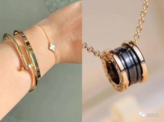 女生在珠宝配饰偏爱网红款,梵克雅宝四叶草、宝格丽慈善款和卡地亚Love手镯至少会晒出一样。