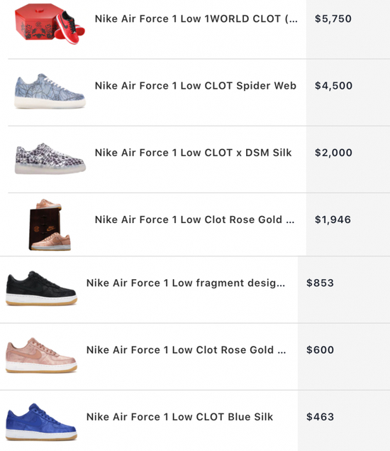 在2019年时释出的CLOT x Nike Air Force 1 “Blue Silk” 目前在StockX上的售价平均为US$463,为该系列最便宜的炒价鞋款。