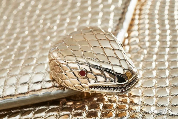 让人过目不忘的外形,要归功于Serpenti Multichain选用的稀有材质水蛇皮。天然排列的鳞片纹理,细腻生动,呈现出熔金色质感的色调,标志性蛇头搭扣则采用了镀金黄铜打造,工匠甚至还专门制作了一颗红宝石色泽的珐琅蛇眼,非常抓人~
