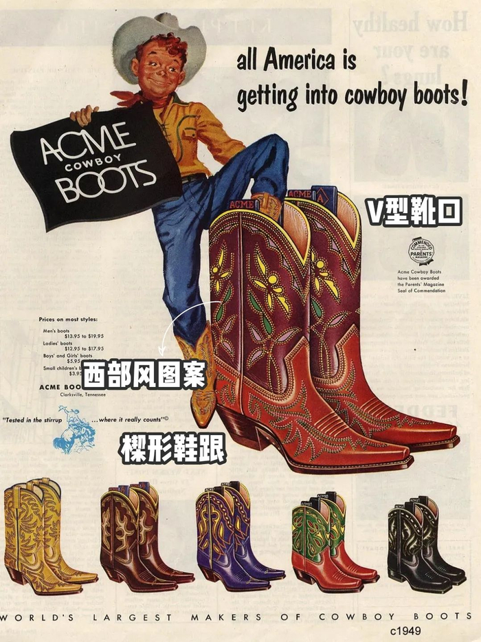 最传统的西部靴鞋跟是楔形的、前后靴口都是V型、鞋头微微上翘,靴子上还有很多西部风格的拼接或绣花图案。具体看这张图:▼