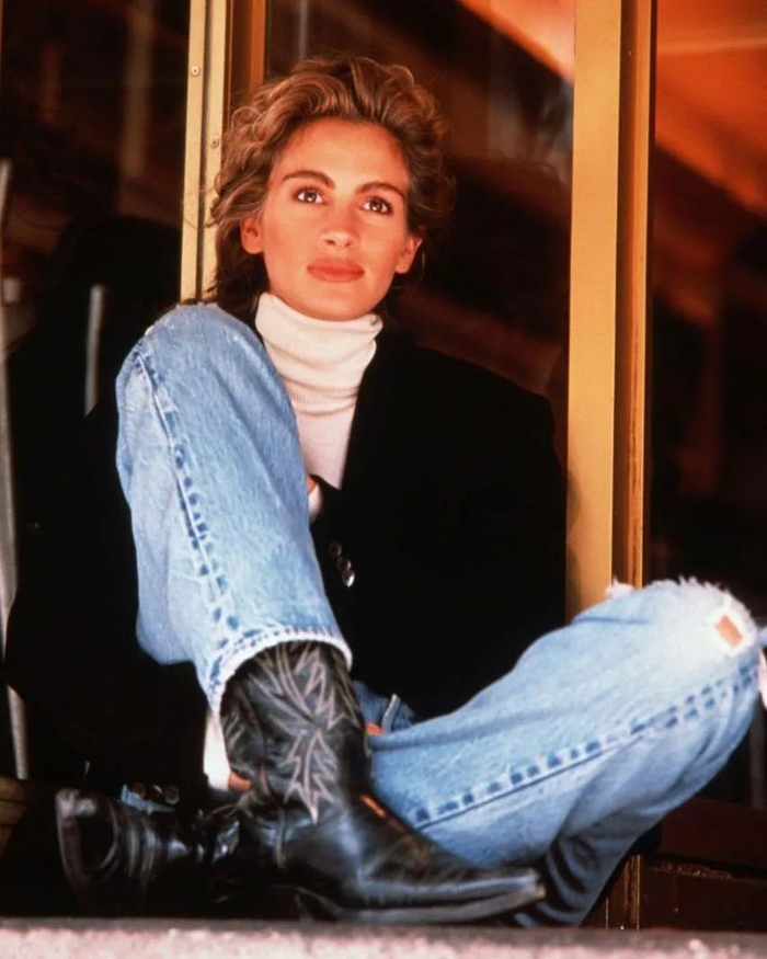 90年代的时尚icon茱莉亚·罗伯茨(Julia Roberts)就很爱它。这双黑色西部靴出镜率好高,她喜欢用牛仔裤搭配。▼