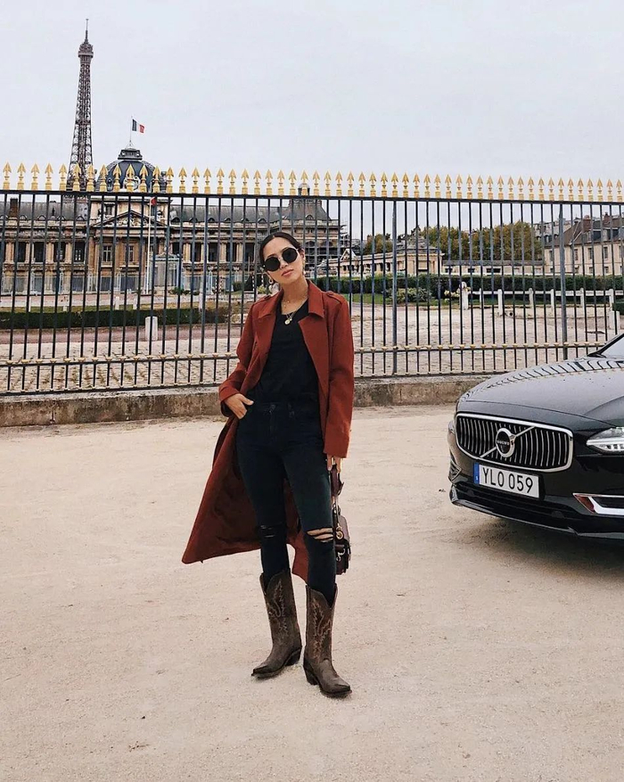 Lisa之前穿过一双棕色的,巨美。这张图也彻底给我种下了棕色西部靴这棵草。▼