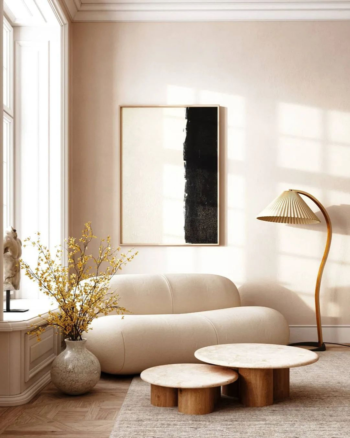 米白色+浅棕色的配色低调含蓄。当墙面、地板等大面积是整体暖调的时候,它会更显温柔。