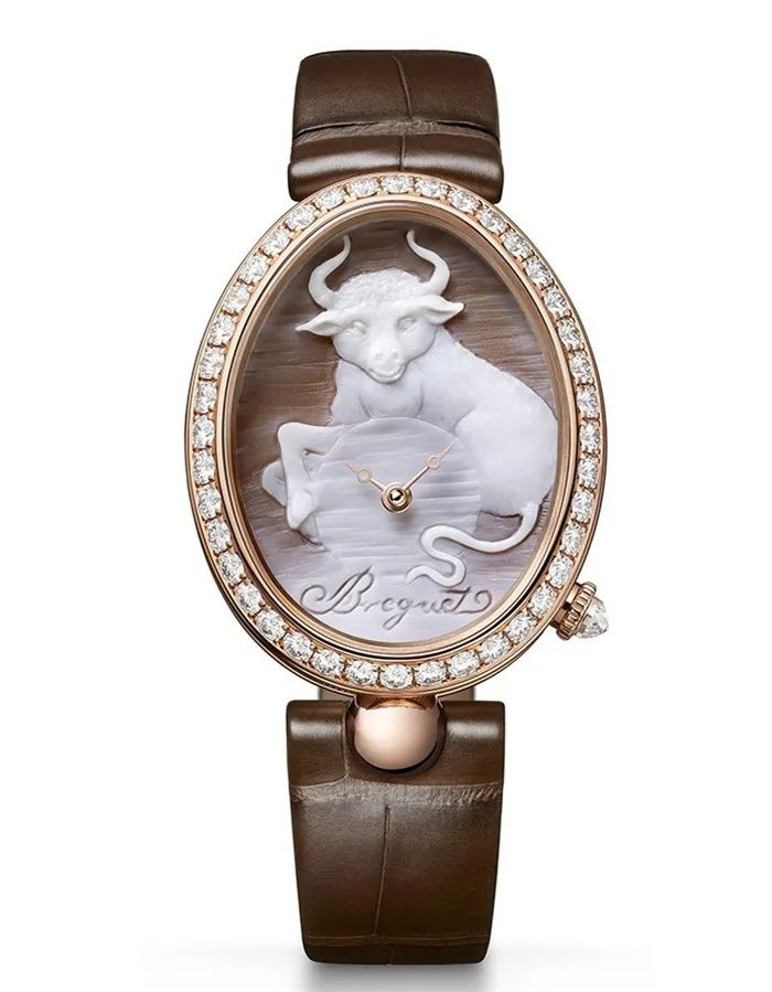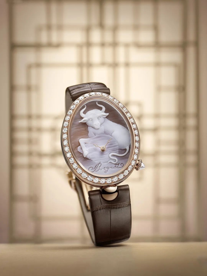 宝玑为中国新春牛年特别推出了那不勒斯王后系列金牛年生肖腕表。盘踞在表盘里生肖牛不仅是整块表最吸睛的亮点,其背后也承载了宝玑非凡的雕刻工艺。通体雪白的生肖牛实际取材于贝壳,通过一对父子档艺术家运用贝壳浮雕工艺配合制作完成。这项工艺也是世界上最古老的艺术之一。
