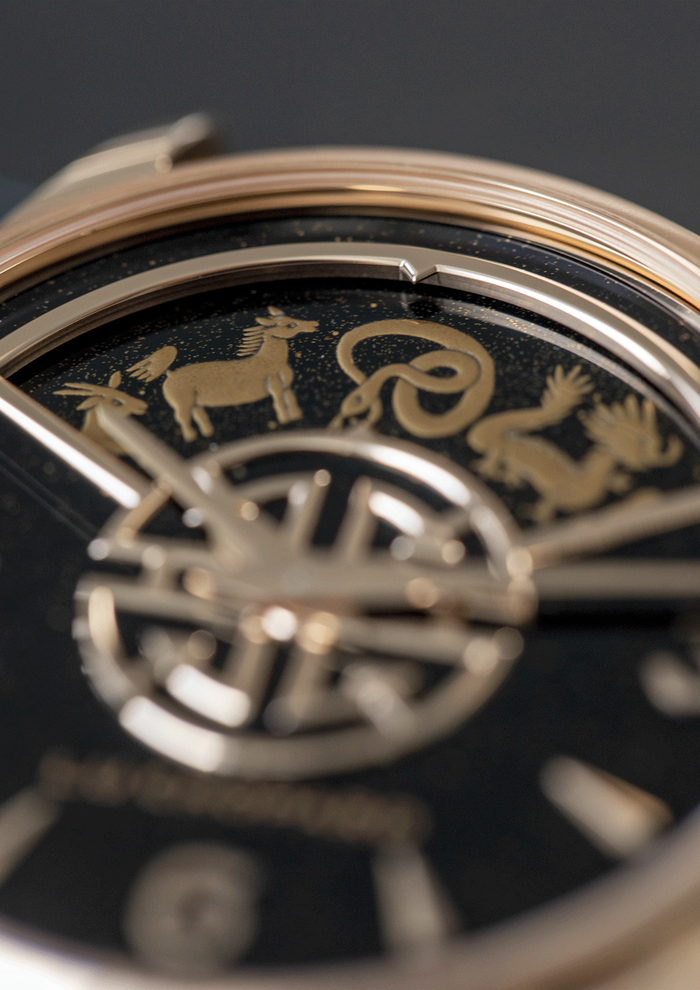 萧邦的 L.U.C XP Urushi Spirit of Shí Chen 莳绘腕表是能显示中国传统计时单位“时辰”的腕表,表盘上方的扇形转盘以莳绘漆艺绘制了十二生肖,对应了十二个时辰。古时候,中国人将一昼夜划分成十二个时段,每一个时段叫一个时辰,一个时辰刚好是今天的两个小时。人们为每个时辰取了优雅别致的名字,或描绘了天地间一景,或是阐明了起居作息的道理。这款腕表巧妙地融合了东方的十二时辰与西方的计时方法,从“子时”(鼠所代表的时段:23点到凌晨一点)开始,至“亥时”(猪所代表的时段:21点到23点)结束。