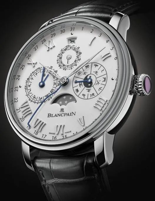 这款腕表采用了45mm直径铂金表壳,搭配大明火珐琅表盘,表冠还镶嵌有椭圆形切割红宝石,与其相得益彰。经典的双圆表圆、镂空柳叶针与立体收腰罗马刻度,无一不演绎着经典宝珀签名式美学。