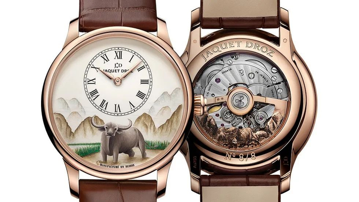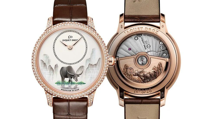 远处的水墨群山,栩栩如生迸发力量感的耕牛意象,一幅中国古代经典田园意象就这样跃然于表盘之上。雅克德罗这次推出的中国新春生肖牛主题限量腕表深耕于中国传统文化,摆脱了符号化的随意堆砌,可谓是做到了真正的因地制宜。