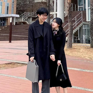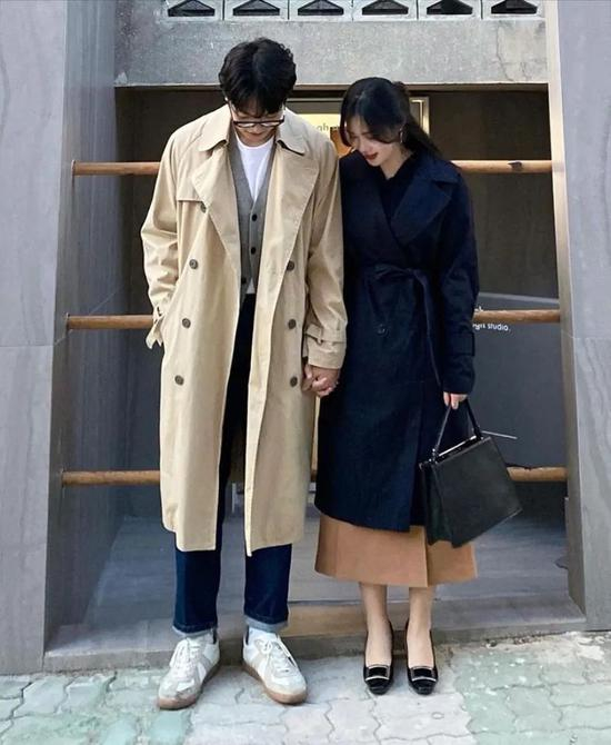 而女生则将颜色反过来,卡其棕色长裙穿搭一件深蓝色风衣,没有一件同款,但在色系上给人统一、舒服的视觉体验。