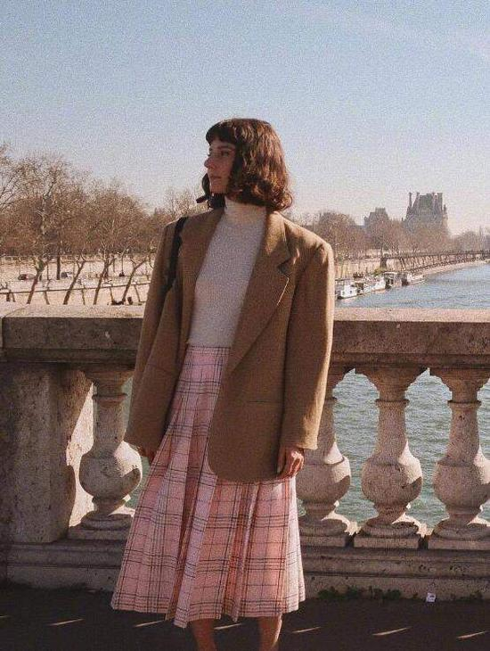 大腿粗的妹纸如果也喜欢穿今年流行的格子半身裙,那么一定要选择这种中长款的款式,长度刚过了膝盖,直筒裙型,最藏肉显瘦无疑,搭配一件白色高领针织,青春少女范十足!卡其色的妮子西装外套,充满了复古感。