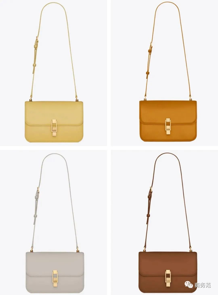 另外一款翻盖包和MAILLON有点像,包包锁扣是方形的,上面镌刻SAINT LAURENT PARIS字样,方正利落的线条,也是一款属于职场大女人的包包。黄色、桔色则多了几分柔和浪漫,春夏背着比较出挑。