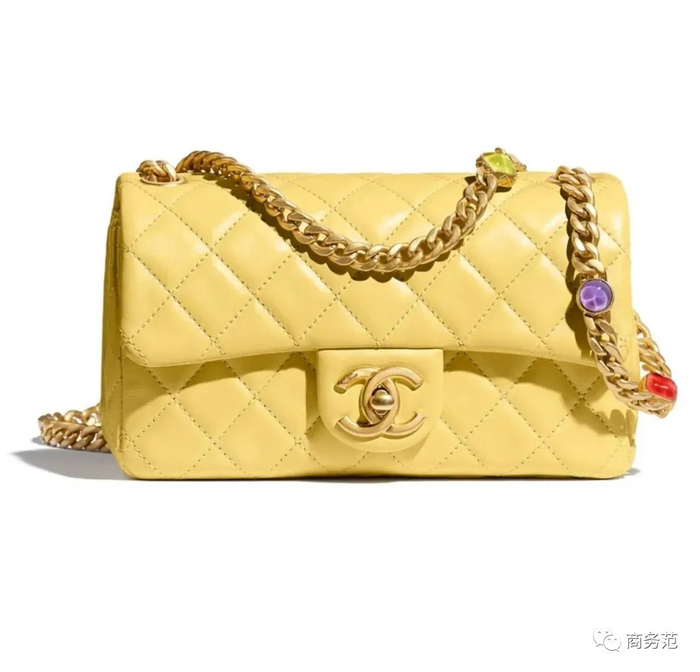 另外也推出了一些季节性的口盖包,像这只黄色的,链条上就有彩色树脂装饰,还有斜纹软呢材质,想降低撞包率的话可以选它们。