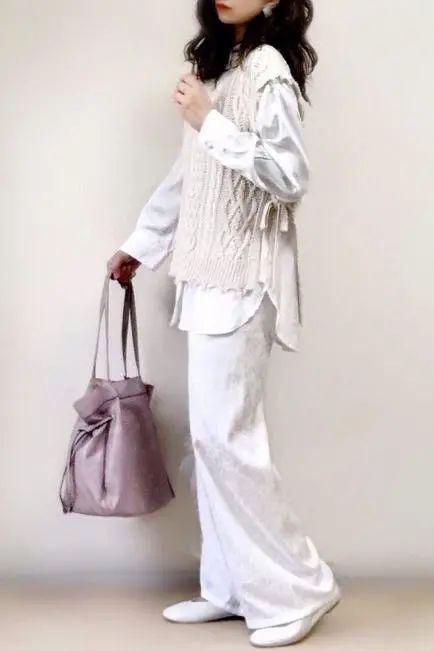 选一袭白衣白裤再搭配素色针织马甲,这一身浅色着装清新淡雅,虽然看着素是素了些,但的的确确很显气质。