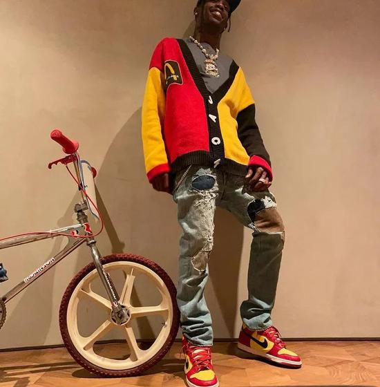 Travis Scott 一直是一位‘神裤爱好者’。CPFM x McDonald‘s x Cactus Jack 开襟衫,Kapital 麂皮贴布拼接牛仔裤,脚踩稀世 Nike Dunk High Premium Orchard Street,上下色调完美搭配,坐实‘Utopia King’称号。