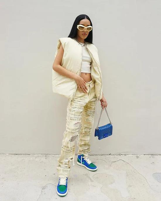 许多先锋女玩家的裤子同样值得注意。与 Nike 多次进行合作的 Aleali May 日前在社交平台上曝光与 Nike 最新合作鞋款 Air Jordan 1 Zoom CMFT 时,则选用曾与 Virgil 有过合作的设计师 Ev Bravado 品牌 WHO DECIDES WAR 米白满印破坏牛裤进行搭配,与上身同色系 Old Celine 马甲结合,彰显深厚搭配功力。