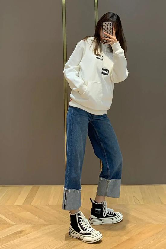 而如果用卫衣配上阔腿牛仔裤,则更具有休闲潮流意味。