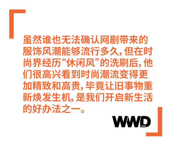业内人士表示,有关摄政时期的时尚潮流还会持续一段时间,从而缓慢的渗透进时尚界。虽然谁也无法确认网剧带来的服饰风潮能够流行多久,但在时尚界经历“休闲风”的洗刷后,他们很高兴看到时尚潮流变得更加精致和高贵,毕竟让旧事物重新焕发生机,是我们开启新生活的好办法之一。