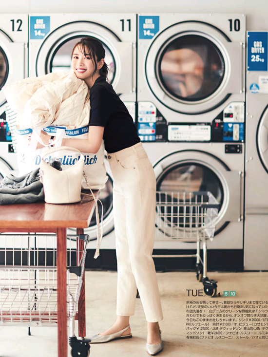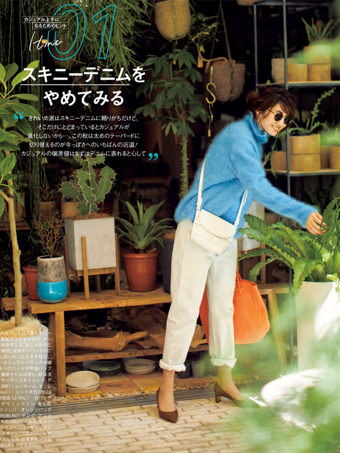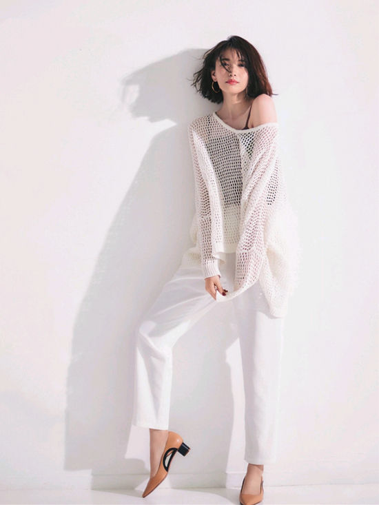 上宽下窄的白裤子,似乎更能穿出利落干脆的效果。九分左右的长度露出脚踝,所以穿起来会更显高显瘦。