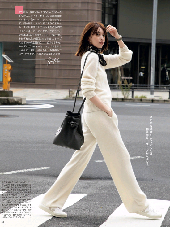 浅粉色针织衫温婉柔和,配以白色锥形裤和白色运动鞋,整体搭配好有温柔的气息~